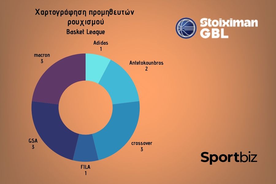 Η κατανομή των παρόχων ρουχισμού δείχνει ότι το ελληνικό μπάσκετ διαμορφώνεται μέσα από ένα πλέγμα διαφορετικών συνεργασιών, χωρίς έντονη συγκέντρωση σε συγκεκριμένα brands. Διεθνείς εταιρείες, ελληνικά σχήματα και πιο εξειδικευμένοι πάροχοι συνυπάρχουν, καλύπτοντας ανάγκες διαφορετικής κλίμακας και προφίλ συλλόγων.