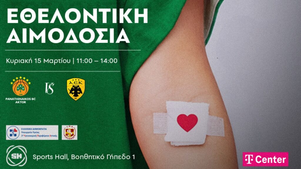 Η ΚΑΕ Παναθηναϊκός AKTOR διοργανώνει την Κυριακή 15 Μαρτίου 2026 δράση εθελοντικής αιμοδοσίας, ενόψει του εντός έδρας αγώνα με την ΑΕΚ BC. Η πρωτοβουλία υλοποιείται σε συνεργασία με την 1η Υγειονομική Περιφέρεια Αττικής, με στόχο την ενίσχυση των αποθεμάτων αίματος.