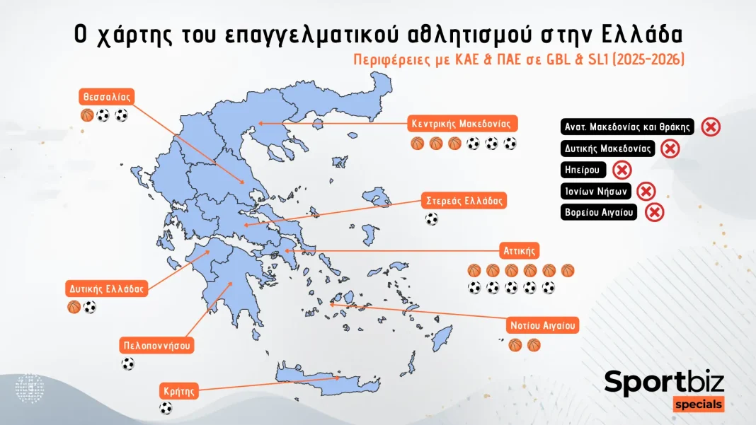 Από τις 27 ομάδες των ανώτερων κατηγοριών σε μπάσκετ και ποδόσφαιρο* (14 ΠΑΕ Super League και 13 ΚΑΕ Basket League), οι 17 βρίσκονται σε Αττική και Κεντρική Μακεδονία – δηλαδή περίπου το 63% του επαγγελματικού χάρτη συγκεντρώνεται σε δύο Περιφέρειες.