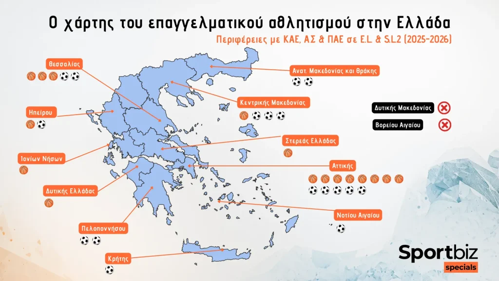 Οι δύο Περιφέρειες εξακολουθούν να απουσιάζουν πλήρως ακόμη και από τη διευρυμένη ανάλυση του δεύτερου μέρους που εστίαζε στις δεύτερες κατηγορίες. Το μηδενικό αποτύπωμα δεν αφορά μόνο την κορυφή, αλλά και τα προηγούμενα στάδια. Πρόκειται για περιοχές που δεν εντάσσονται ουσιαστικά στην πυραμίδα του επαγγελματικού και ημιεπαγγελματικού αθλητισμού, γεγονός που αποκαλύπτει βαθύτερα διαρθρωτικά όρια.