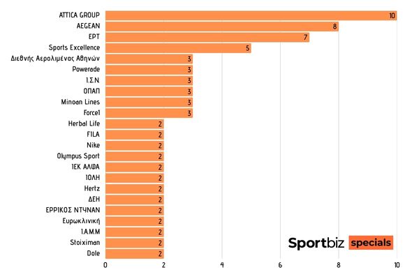 Στην κορυφή των χορηγών με παρουσία σε πολλαπλές ομοσπονδίες βρίσκεται η Attica Group, η οποία διατηρεί συνεργασίες με 10 αθλητικές ομοσπονδίες. Η εταιρεία αξιοποιεί την ισχυρή της θέση στην ακτοπλοΐα, καλύπτοντας λειτουργικές ανάγκες μετακίνησης και επιλέγοντας έναν σταθερό ρόλο υποστηρικτή του ελληνικού αθλητισμού.