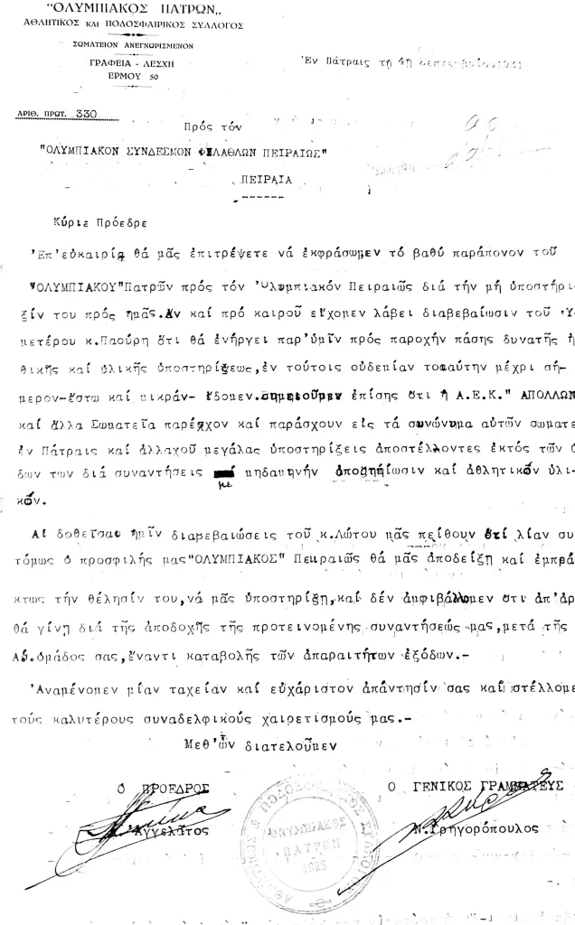 Απόσπασμα από επιστολή του Ολυμπιακού Πατρών προς τον Ολυμπιακό Πειραιώς, στις 4 Σεπτεμβρίου 1931. Εκφράζονται παράπονα πως οι Πειραιώτες δεν συνδράμουν τους Πατρινούς (με τη διεξαγωγή φιλικού αγώνα στην Πάτρα, σε αντίθεση με την ΑΕΚ και τον Απόλλωνα Αθηνών που βοηθούν τα συνώνυμα σωματεία στην Πάτρα!