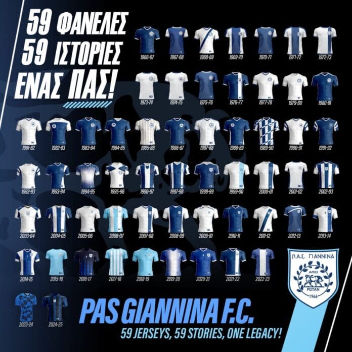 Η ΠΑΕ ΠΑΣ Γιάννινα ανακοίνωσε μια ξεχωριστή πρωτοβουλία, παρουσιάζοντας τις συλλεκτικές φανέλες «59 Jerseys – 59 Stories – One Legacy», που ξαναζωντανεύουν 59 χρόνια ιστορίας του συλλόγου. Οι εμφανίσεις, διαθέσιμες προς τους φιλάθλους, σε συνεργασία με τη Hall of Brands, συμβολίζουν τις διαφορετικές αγωνιστικές εποχές και ενισχύουν οικονομικά την ομάδα, καθώς μέρος των εσόδων υποστηρίζει τα ταμεία της ΠΑΕ.